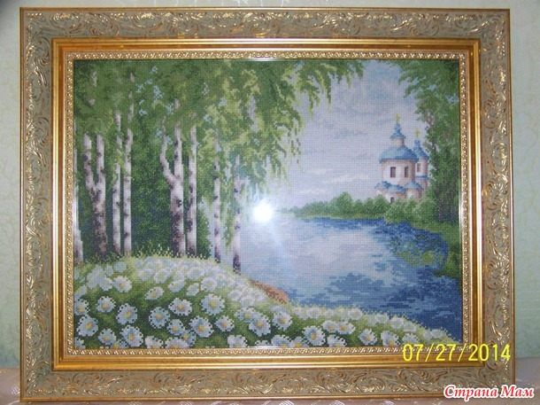 Хотела давно похвастаться, но все как то не получалось, то инет вис, то вообще забывала))))). Я отношу себя к ну очень творческим личностям, быстро загораюсь, но и быстро затухаю)))))))... лежит много картин начатых, незаконченных, мне важен сам процесс, а когда остается 2-3 крестика -все мне картина не интересна и просто лежат у меня. А тут случился юбилей подруге и конечно встала проблема с выбором подарка - у нее все есть, ну конечно это так я считаю и решила я ей вышить именной оберег фирмы Раnna с использованием мулине и бисера, ну конечно пришлось идти в багетку. Пошла и до кучи захватила свою березовую рощу от "Золотое руно" вышивала давно когда беременная была, а т. к. ребенку уже 5ый год, то можно сделать вывод, что про незаконченность работ я не вру)))