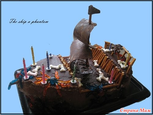 потом остаки сливок и глазури я просто смешала и этим кремом покрыла борт корабля