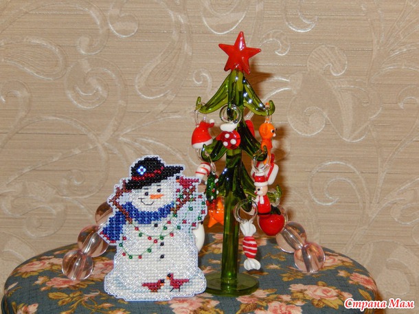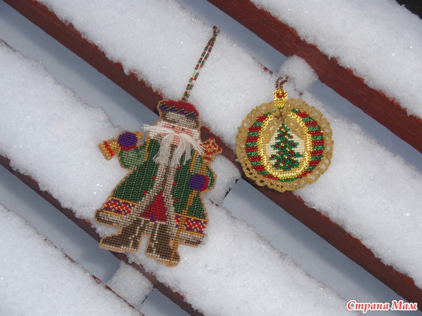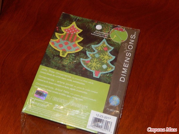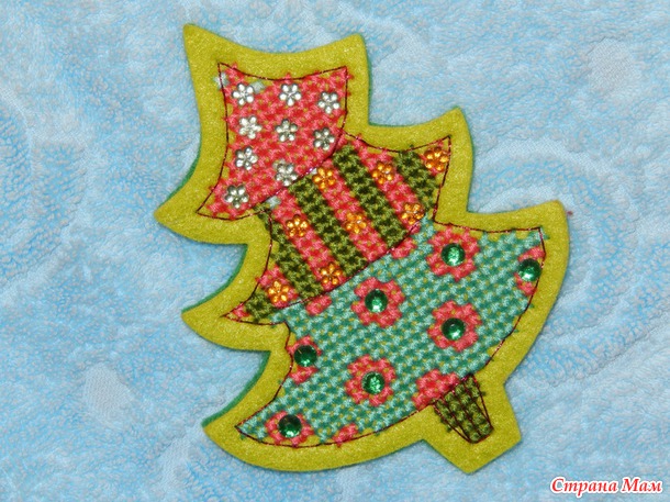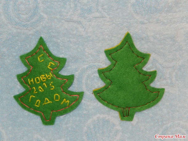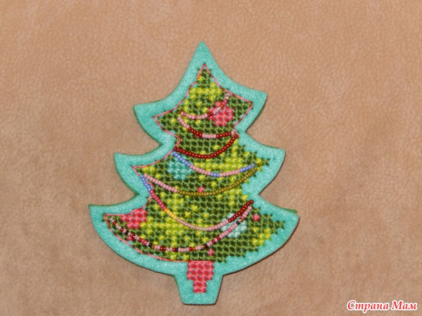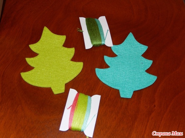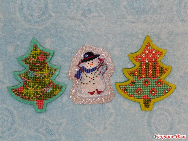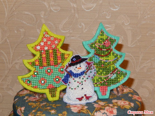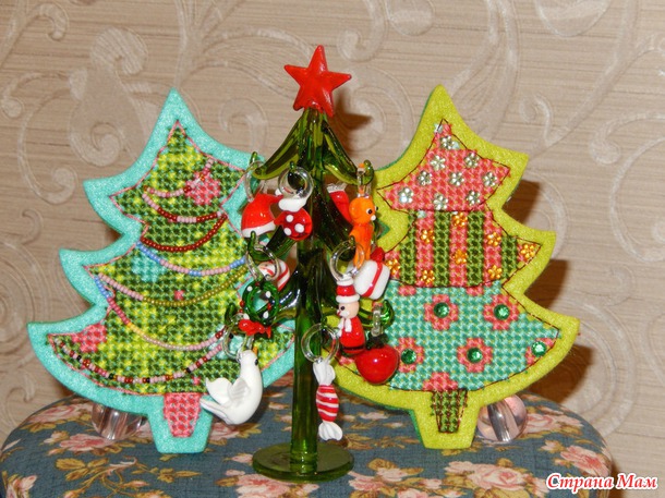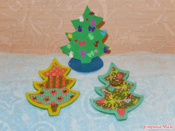 Покупала Димовский набор. На фетровых ёлочках вышивка. Как всегда я внесла изменения свои.