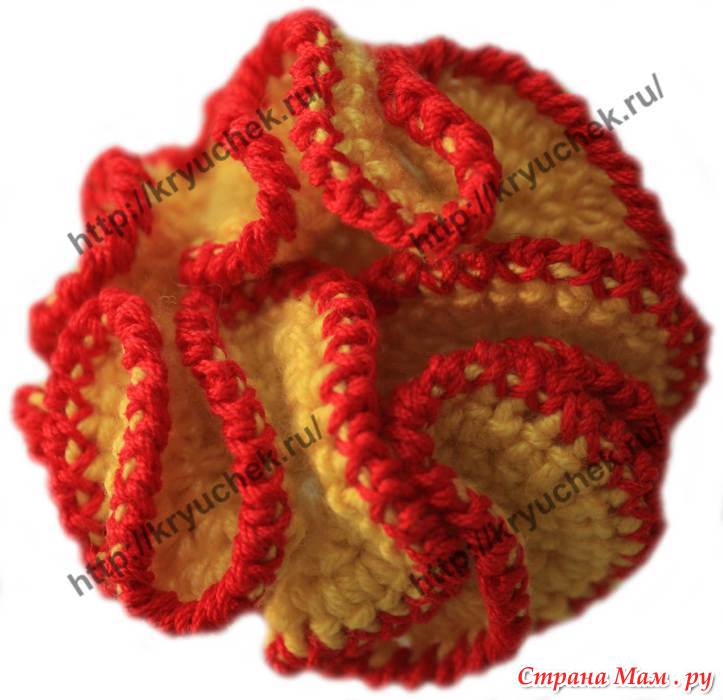 7 ряд: 1 ВП, двигаясь слева направо вяжете «рачий шаг» б/н в каждый СБН предыдущего ряда. В конце соединяете с первым «рачьим шагом» б/н. Отрезаете нить и, закрепив петлю, прячете в петли цветка.