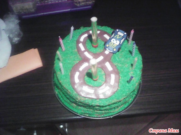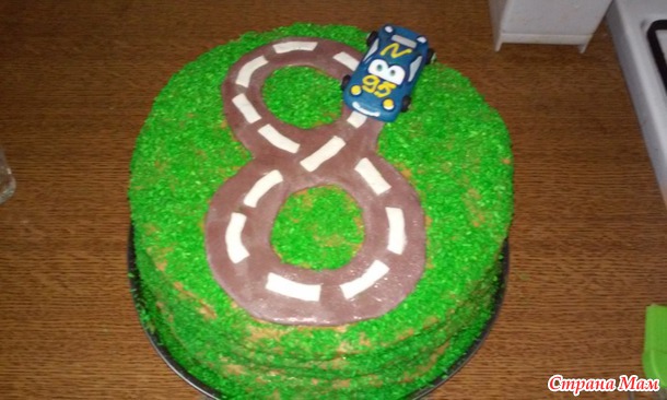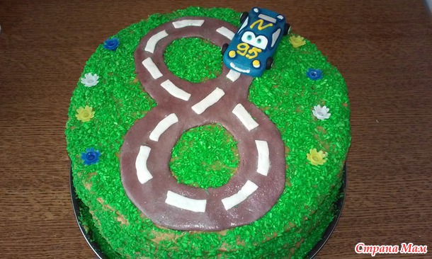 Обсыпаем торт кокосовой стружкой- создавая подобие травки и выкладываем нашу восьмерку