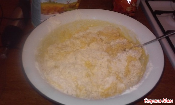 Интенсивно мешать, сняв с огня. Добавить муку.