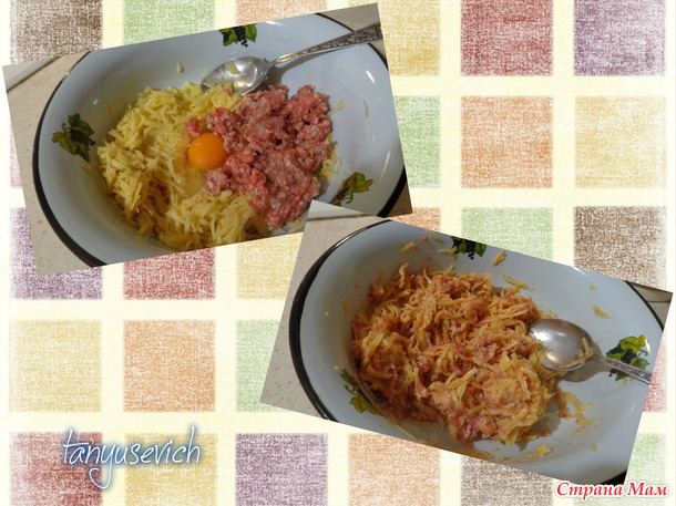 Когда занимаюсь лепкой котлет, тефтелей, 100-150г фарша иногда откладываю на это "баловство", чищу 5 средних картофелин, тру на крупной терке, добавляю 1 яйцо, соль-перец по вкусу, хорошенько вымешиваю.
