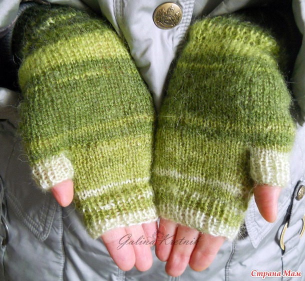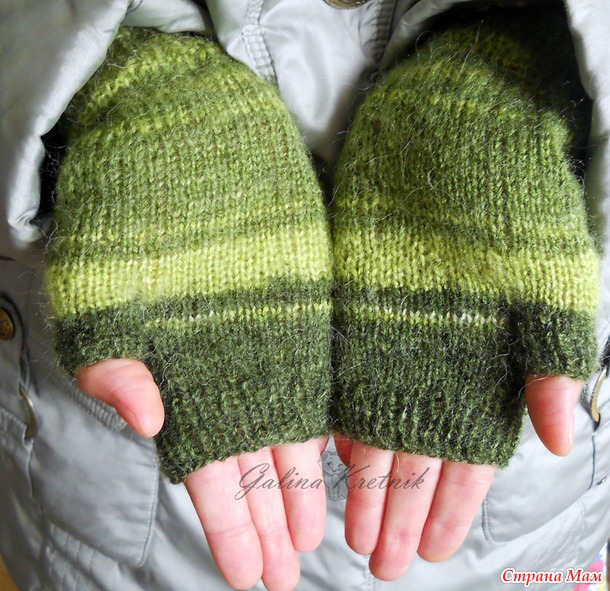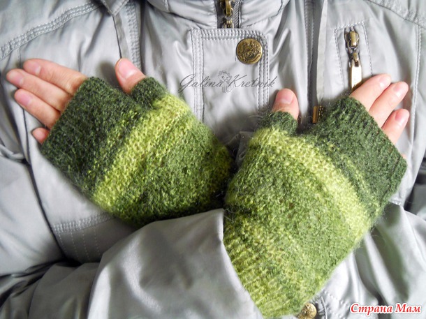 Кстати, этот способ вязания мне очень понравился. Вяжется просто, сидят митенки хорошо. А те, первые, крючковые митенки, я в варежки вставила, как подкладку. Получились тёплые двойные варежки.