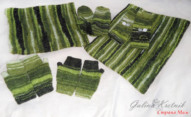 Тогда решила пустить на мелочи. Под куртку снуд с варежками-митенками связать.