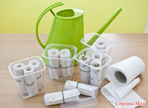 На дно упаковки кладут пять-семь слоев туалетной бумаги. Можно также использовать косметические бумажные салфетки или бумажные полотенца. Важно, чтобы мокрая бумага потом легко разрывалась и освобождала корешок крошечного растения. Вата или марля для такой цели не подходит.