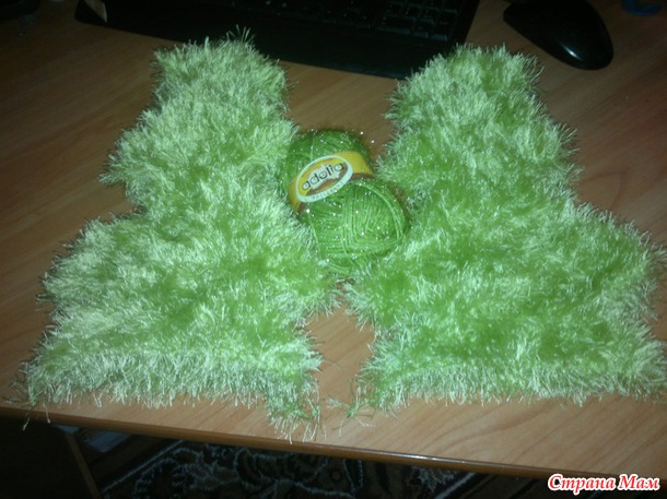 Взяла другую травку (остатки), просто обвязала бутылку шапанского. Купила по два метра леточек. Навязала бантиков на вилке. Пришила.