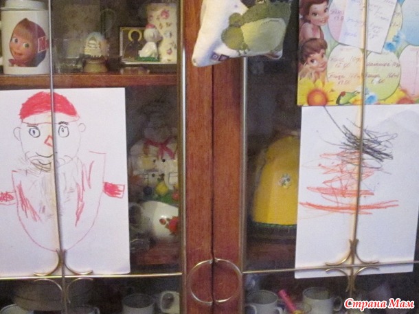 , но зато сами и повесили свои работы на шкаф- любоваться, а малой все повторяет с свою картину тоже привесил, ну по цветам понятно, что изобразил дедушку