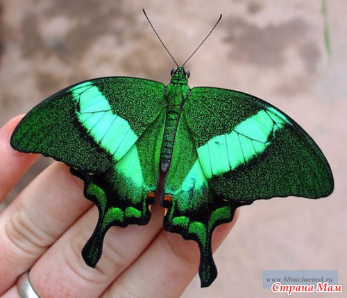 Парусник Палинур (Papilio Palinurus). Размах крыльев 9 – 11 см. Эта бабочка обитает в Бирме, Малайзии, Индонезии и на Филиппинах. Это одна из немногих дневных бабочек, окрашенных в зелёный цвет. Благодаря этому её трудно заметить среди зелени листвы. Ярко-зелёные, с металлическим отливом, полосы на крыльях переливаются в лучах Солнца от тёмно-зелёного до бирюзово-голубого цвета и резко контрастируют с бурой окраской на нижней стороне крыльев. В домашних условиях Парусник Палинур живёт от одной до двух недель. В качестве пищи предпочитает свежевыжатый фруктовый сок.