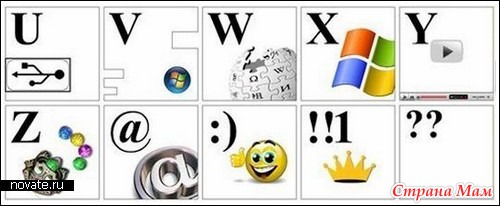 Например, нам нужно научить ребенка иностранному языку – английскому. Обычно это начинают делать с 5-6 лет, кто-то раньше, кто-то позже, не в этом суть. Важно то, что к этому времени очень многие современные дети уже знакомы с компьютером. Отсюда появляется и вариант такого алфавита – для «продвинутых» детей, детей будущего, детей 21-ого века. Вместо слова apple под буквой А мы видим значок известной компании, который знаком уже и многим детям. Под буквой В – не bee и не рисунок пчелы, а кое-что посовременней – Bluetooth, технология, также понятная детишкам. Соответственно, как мы видим, затея понятна – обычный алфавит детям вряд ли будет интересно учить, в таком же – все символы уже понятны. Под буквой J мы видим рисунок Java, под буквой V – значок Windows Vista, а под U – ничто иное как символ USB.