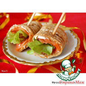 Положить рыбу и листик салата на хлебцы, скрутить рулетик, разрезать его вдоль на две части и скрепить шпажкой или зубочисткой.