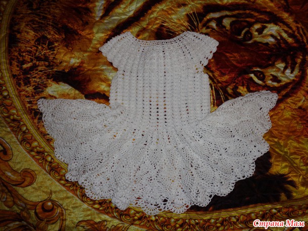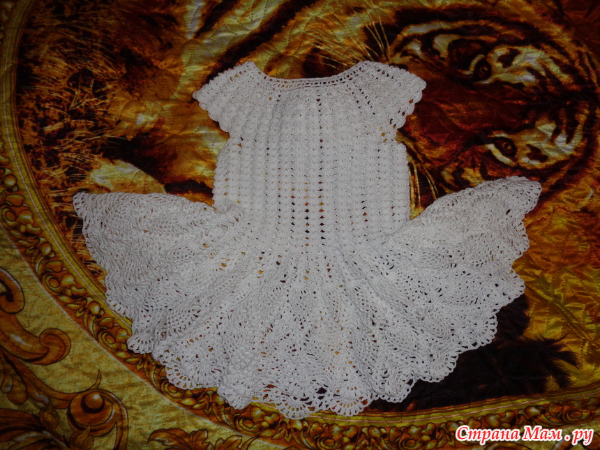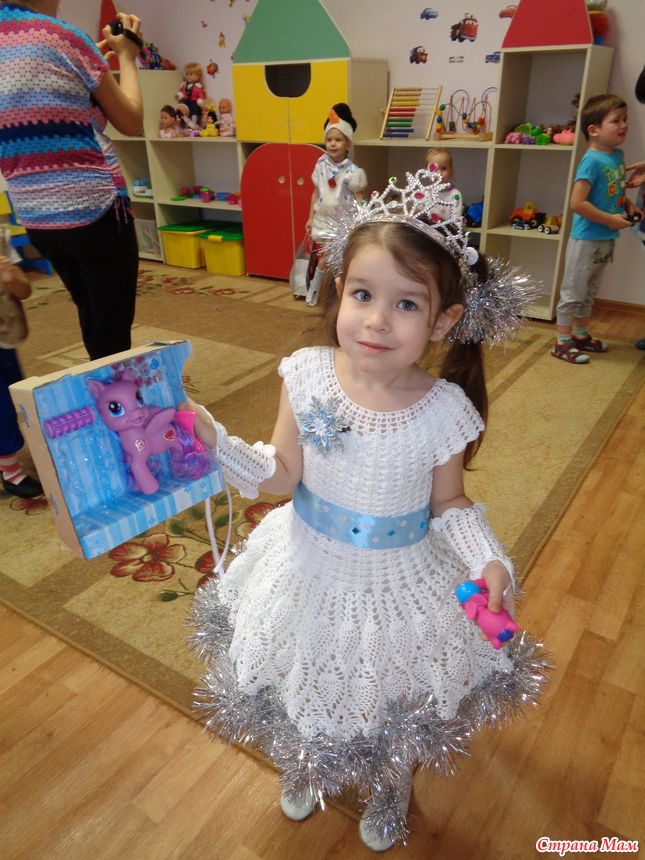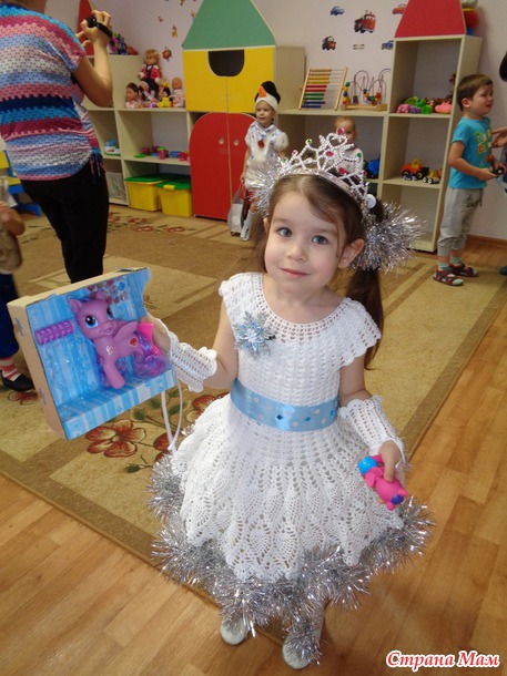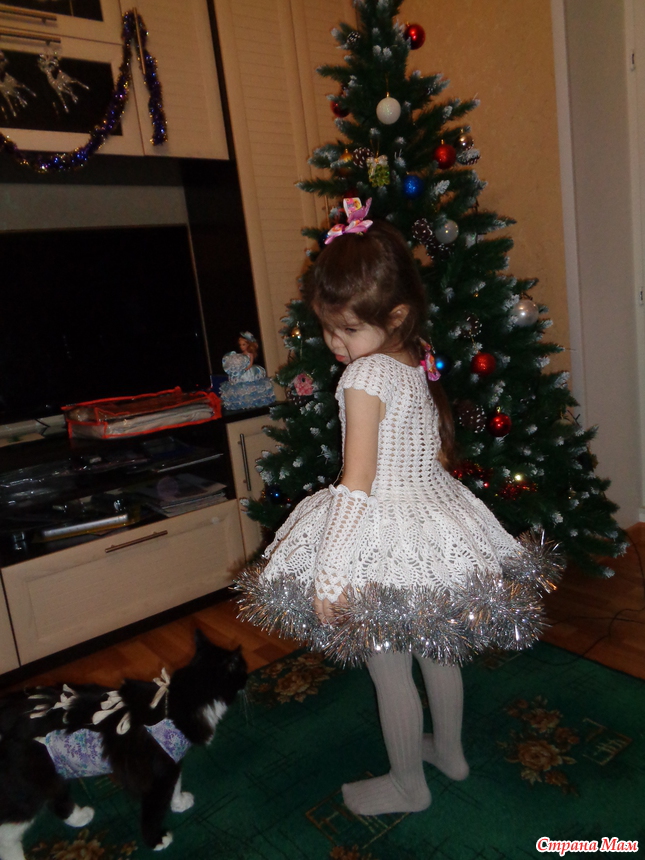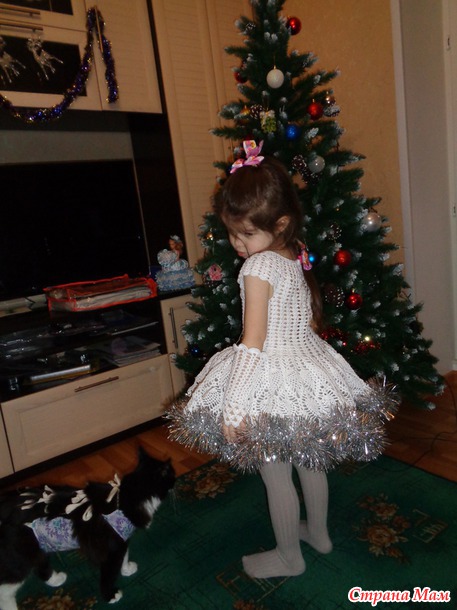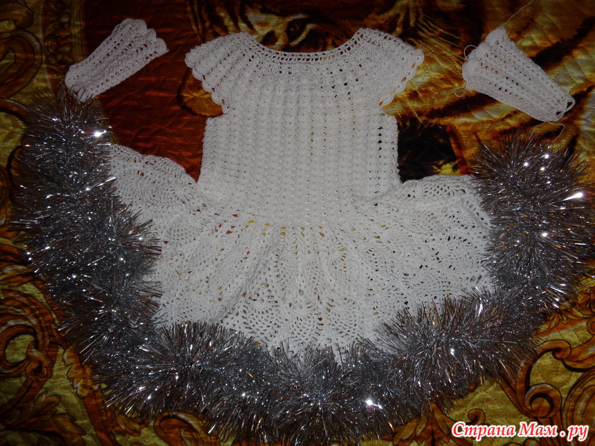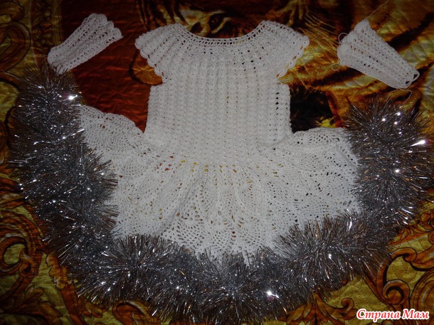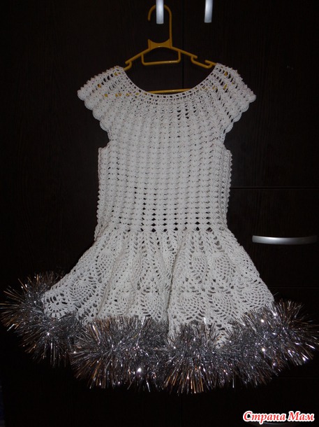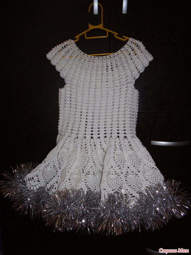 Связалось вот такое платье к новому году, дочь в саду будет снежинкой, идею верха брала у Надежды в онлайне, но она перенесла свою запись в дневник, не могу добавить ссылку, а юбочку искала в интернете, т. к в СМ не работали фото, пряжа коко 200гр, крючок № 2, мишура.