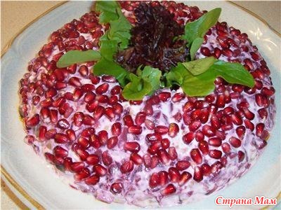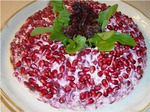 2. Подготовленные продукты уложить в салатницу слоями: говядина, морковь, майонез, яйца, говядина, майонез, морковь, грецкие орехи, майонез, зерна граната.