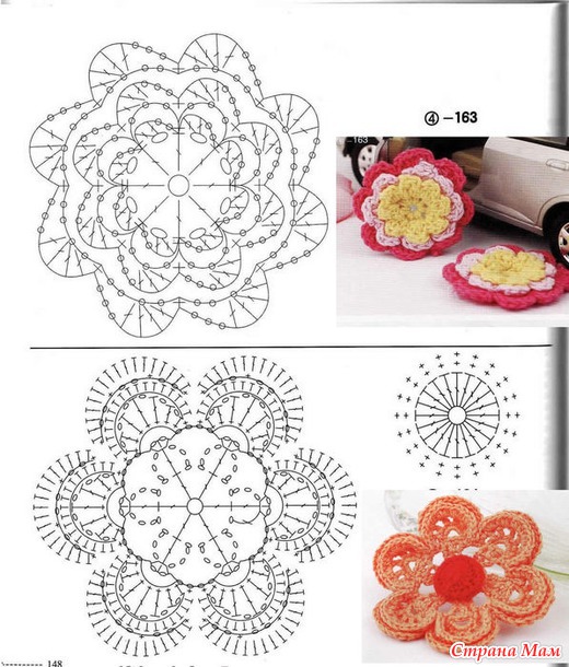 Простой берет с цветочными мотивами. Вырезала круг из газеты диаметром 30 см. Навязала мотивы, схемы внизу прилагаются: