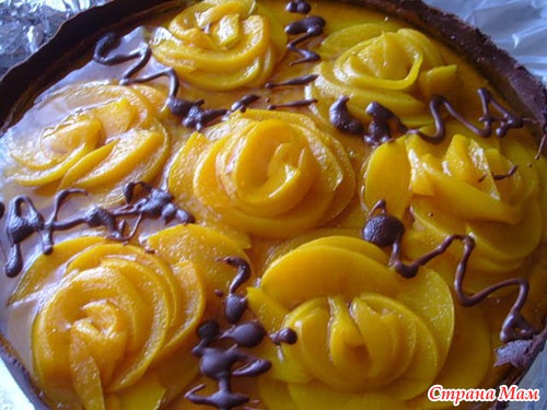 Персики нарезать тонкими пластинками и выкладывать на торт ввиде розы; один персик-одна роза.