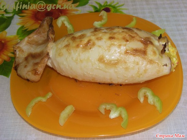Кальмары (тушки) очистить и нафаршировать фаршем из - шампиньонов, рыбы, яий, лука зеленого, укропа, креветок, сливок и сметаны, (фарш варирую по усмотрению) поставить в духовку на 35-50 минут. Рекомендую смазать сметанкой тушки и накрыть фольгой (чтобы не пересохли). Приятного аппетита!!!