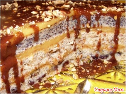 Тесто разделим на три равные части. Первая – орехи; вторая – мак; третья – изюм. Между слоями и сверху помажем варенной сгущенкой, взбитой со сливочным маслом (250 г). Выпечем до золотистого цвета в форме на кальке, предварительно смажем маслом. Остудим и смажем охлаждённым кремом.