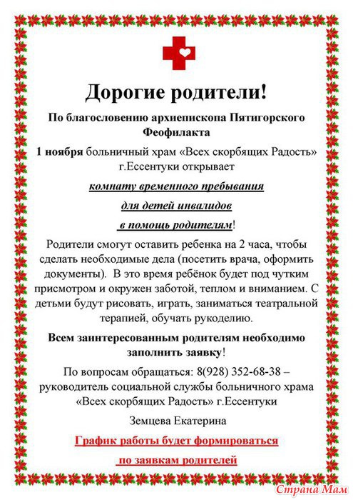 Открылась комната временного прибывания для детей инвалидов. Там родители смогут оставить детей на 3-4 часа и с детьми поиграют,порисуют, позанимаются...