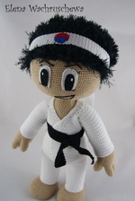 Вот такой талисман для клуба карате у меня получился) рост чуть больше 40 см, крючок номер 2,5, а для поясов крючок номер 1,5 ( пряжа более тонкая). Получился тяжеленький, особенно голова, но надеюсь качественно ее укрепила))) сам стоит, проволочный каркас.