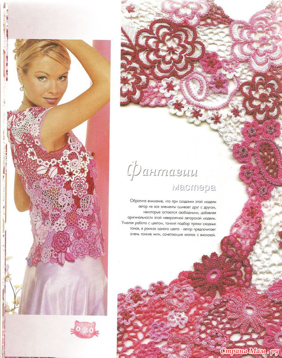 А Вы знаете, как раз ирландские кружева у меня много времени и не занимают. Ведь вяжешь по цветочку (листочку). Пара маленьких клубочков в кармане и несколько минут, пока закипит чайник, и вот цветочек готов. Так в течение дня навяжу маленьких деталек. А вечером, когда уложу малышей спать, собрала как мозаику, листиками присоединила. Внучке топ получился за неделю. Честно говоря, сама не ожидала. Думала, что вязать буду все лето, носить будет некогда. Оказалось, только с виду сложно. Глаза боятся, а руки делают. Попробуйте, Вам понравится.