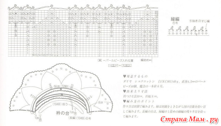 Провязваем ещё 3-4 ряда "сеточкой". Ряд ст. б/н. Набираем по краю петли на спицу, количество сверяем со схемой рюши.