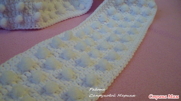 Шапочка мне очень понравилась, связала ее практически сразу, как увидела (верх из Джинса, внутренняя шапочка из Софти), а вот с оформлением сражалась долго - все мне что-то не нравилось. А затем решила связать в комплект шарфик. Хотелось чего-то простого, но с изюминкой, что у меня получилось - судить Вам. Для шарфика использовала Джинс и Марифетли. Шарфик связан столбиками с накидом по кругу (можно для примера взять любую схему подашвы пинеток, чтобы посмотреть прибавки, я вязала без схем). Вот запечатлела рождение самого шарфика (если вдруг вопросы возникнут, т. к. мне проще показать, чем описать это словами