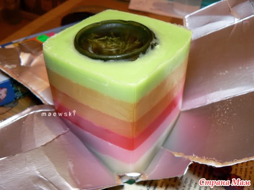 пирожинка сделана из детского мыла: молоко, апельсиновый сок,кофе натуральное,эф. масло апельсина, лимона, бергамота, мак как украшение, белый слой молочный, заливала слоями....вроде ничего не забыла