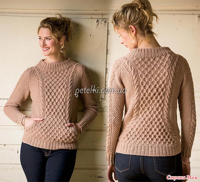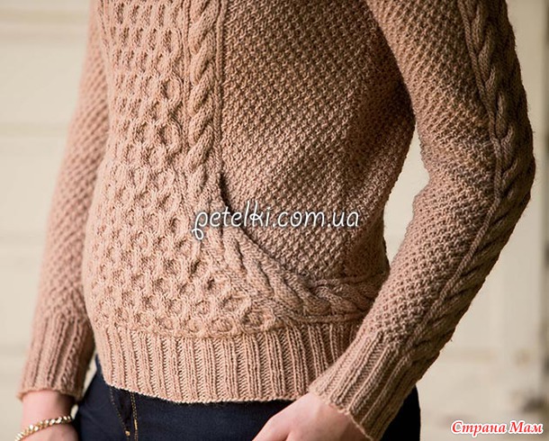 Интересный пуловер рельефным узором с карманчиками. Поистине очень стильная и оригинальная моделька для любого возраста.