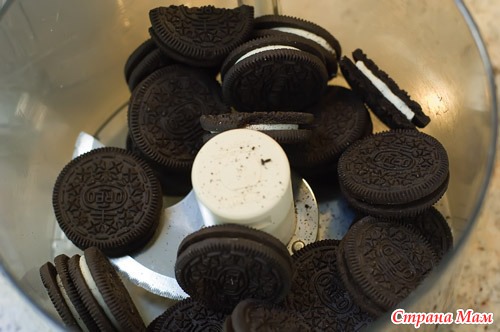 Пока горшки замораживаются нам необходимо изготовить внешнюю, видимую часть грунта. В этом нам помогут молотые шоколадные печенья. Молоть проще всего в кухонном комбайне. Если его нет, можно просто положить печенья в плотный поэлитиленовый пакет и поездить по ним скалкой до получения однородной массы.