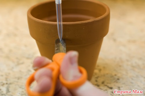 Далее, берем трубочку для коктейля, отмеряем высоту на 2 см меньше высоты горшка и отрезаем.
