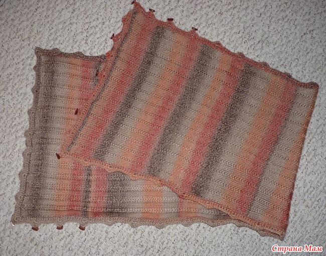 По мотивам шикарного шарфа https://www.stranamam.ru/post/881585/ я решила связать свой вариант, т. к. ниток опять было в обрез и на болеро не хватало. Шарф связан на машинке Каскад. Готовое изделие отпарено и обвязано крючком.