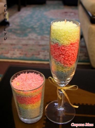 Для работы потребуется: воск нескольких расцветок, терка, тонкая свеча, фужер: