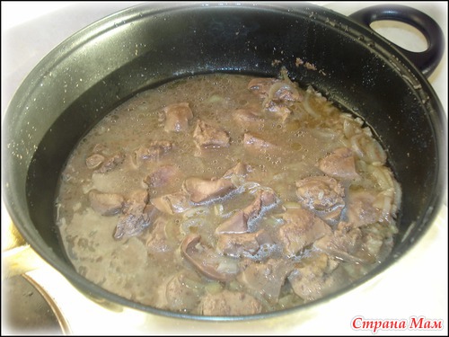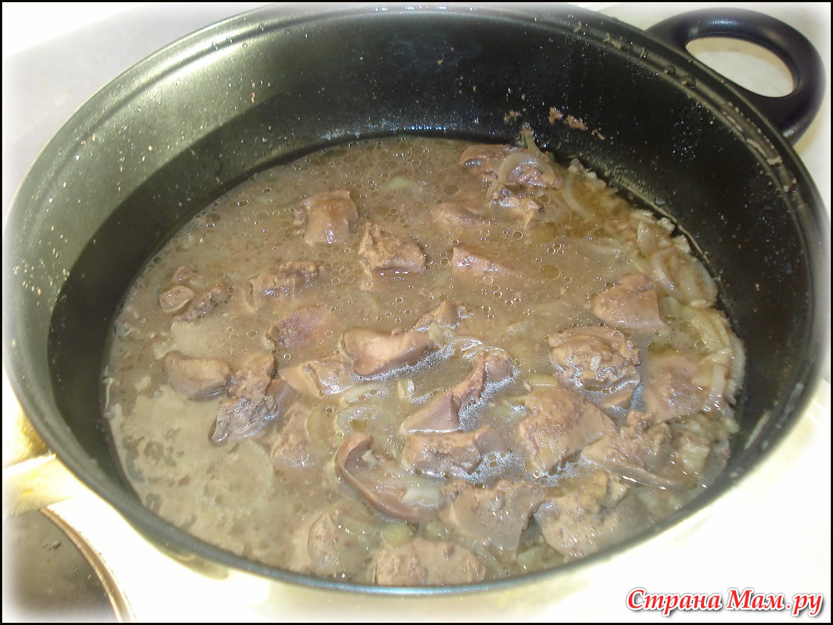 Далее протушиваю куриную печень. Солю, в конце добавляю лук и чеснок. Вообще сюда можно добавить очень многое на ваш вкус -это может быть и болгарский перец и помидорка и другие овощи.