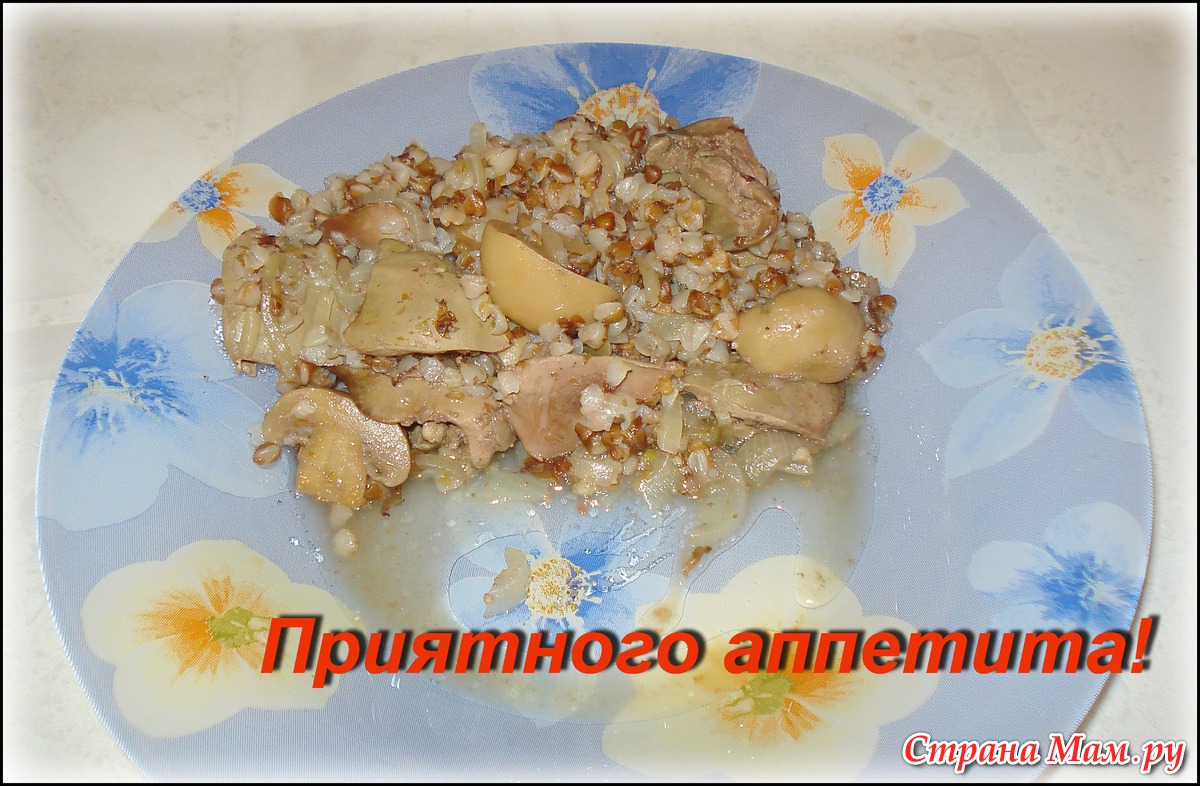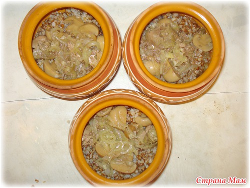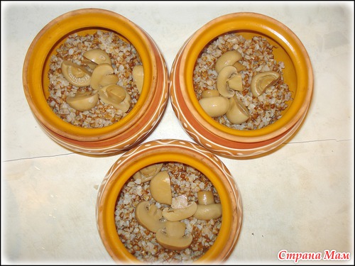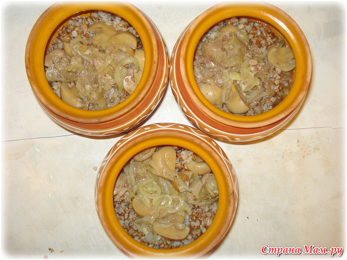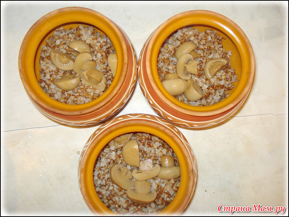 Заранее отвариваю гречневую крупу до полуготовности. И в горшочек выкладываю слоями. В начале куриную печень с луком.