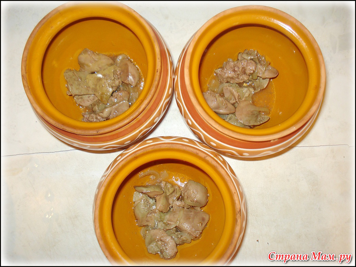 И далее выкладываю оставшуюся печень. Заливаю каждый горшочек бульоном в котором тушилась печень с луком и чесноком.