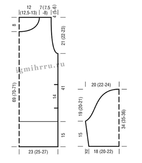 Перед: вязать как спинку, но после белой нижней планки вязать серой нитью. Через 8 см и через 22 см от нижней планки с обеих сторон сделать по метке = входы в карманы. Проймы вывязать, как описано для спинки. Через 13 (14-15) см = 26 (28-30) р. от начала пройм закрыть для горловины средние 14 (16-18) п. и обе стороны закончить раздельно. Для закругления горловины закрыть с внутреннего края в каждом 2-м р. 2 раза по 3 п., 2 раза по 2 п. и 3 раза по 1 п. = 12 (13-14) п. плеча. Через 21 (22-23) см = 42 (44-46) р. от начала пройм петли закрыть. Вторую сторону закончить симметрично.