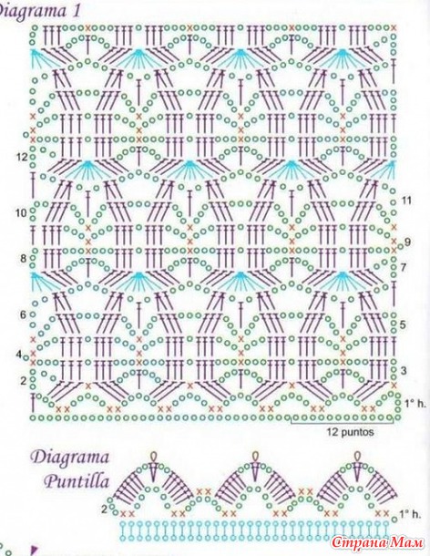 Начала вязать сверху. Как на фото схемки верха (Диаграмма 2). Моими тоненькими ниточками - вышло 3 целых рапорта.