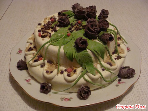 Покупаете бисквитные коржы 2 упак.Я брала светлые.Одну обрезала ,диаметр поменьше для второго этажа нужен.