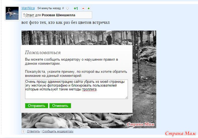 Доброй ночи и утра, если уже наступило завтра...!!! У меня такая просьба к администрации - излагаю... (:) Мне в комменты кто-то кинул фотографию с телами жертв нацизма. Второй пользователь на все лады стала цитировать зверства фашизма, при чём с настолько ужасающими подробностями, что я сразу поняла, что это троллинговая атака. Но - пожаловаться на комментарий я не могу, так как правилами сайта запрещено выкладывать именно порно, но не текст и фото- видео- материалы, содержащие жестокость. Открыть тему я не могу, потому что боюсь и не хочу, чтобы эти жуткие комменты прочла ненароком какая-нибудь беременная пользователь сайта. Поэтому прошу дополнить пункт правил, запрещающий публикацию порно-текстовых, фото- и видеоматериалов, а также - СОДЕРЖАЩИХ ИНФОРМАЦИЮ О НАСИЛИИ И ЖЕСТОКОСТИ.