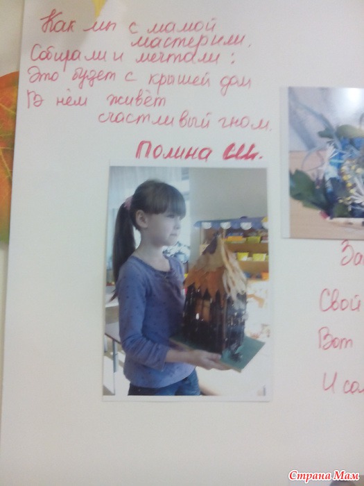 Долго ли коротко ли, но время шло, пошли в парк собирать ветки, листья и прочий природный материал. как собирали и сушили - отдельная история. В общем долгими общими усилиями мы осилили этот домик. получилось на славу, самим понравился больше сам процесс, чем его результат. Полина успешно приняла участие в выставке в саду "Осенние фантазии", защитила свою поделку и получила сувенир.