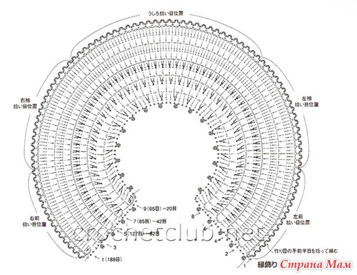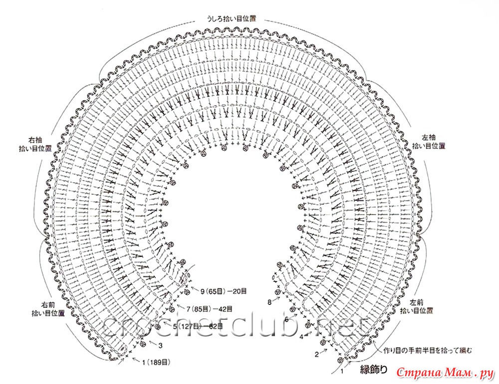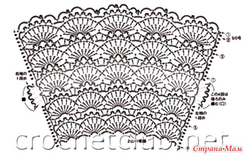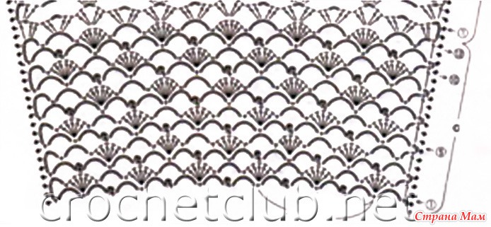 Вязать начинала со схемы 1 в обратном порядке. Т. е. с более узкой части, а потом делала расширение, придерживаясь схемы. Цепочку набирала из 115 в. п. + 3 петли подъема. Последний ряд на кокетке из арочек по 3 в. п я не делала.