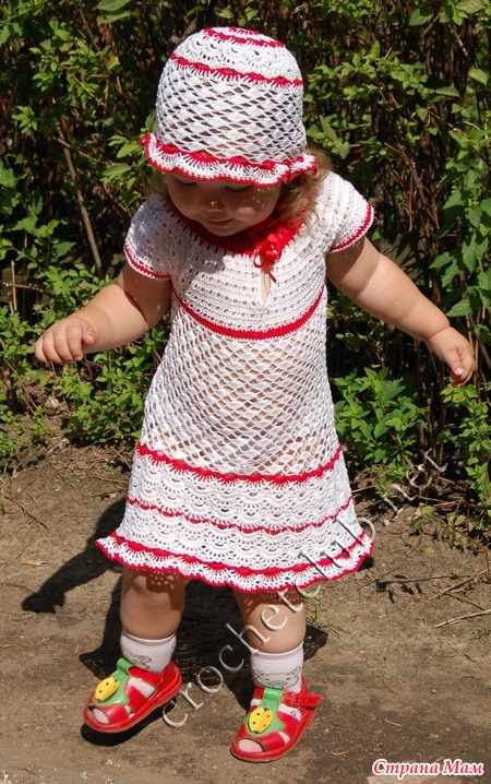 В таком наряде вашему ребенку не будет жарко. На горловине атласная лента, но можно пришить пуговку. Связано из пряжи «Ирис». В комплект входит шапочка-панамка и платьице, связанное без единого шва.