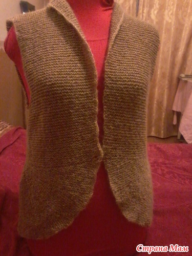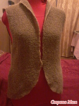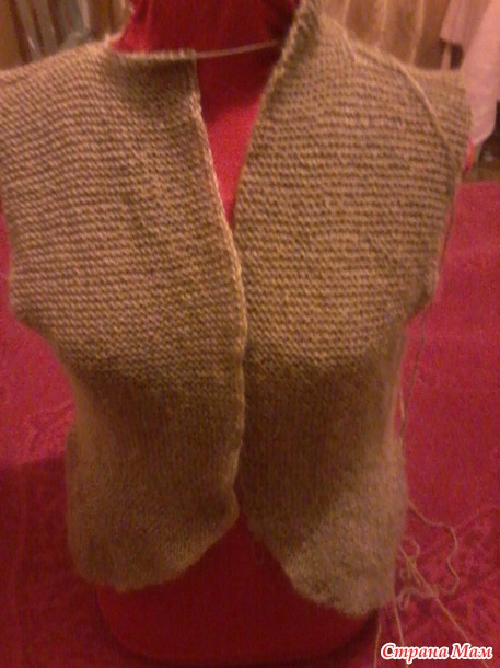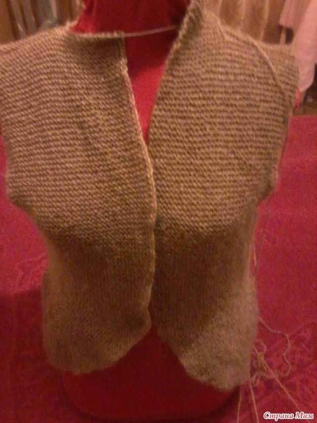 Когда длина спинки составит 56 см, закрыть средние 22 петли эластичным способом (чтоб не стягивало горловину). В следующем ряду по краю выреза убавила еще по одной петле. Через 2 см закрыла петли. Общая длина спинки составила 58 см.