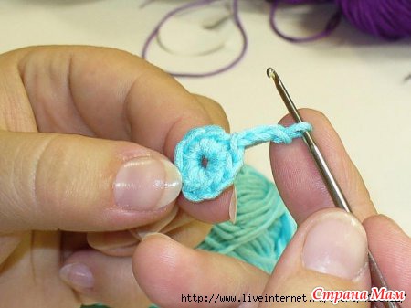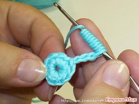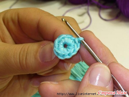 Набрать цепочку из 4-х воздушных петель, замкнуть в кольцо и обвязать столбиками без накида.