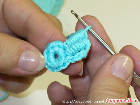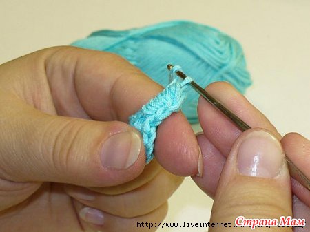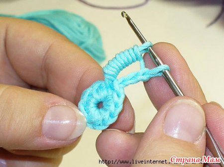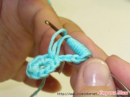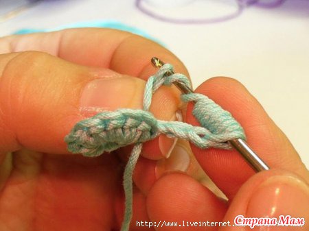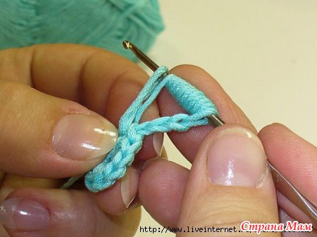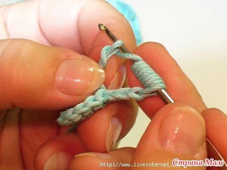 Вытянуть нить из предыдущего ряда на высоту 3 воздушных петель
