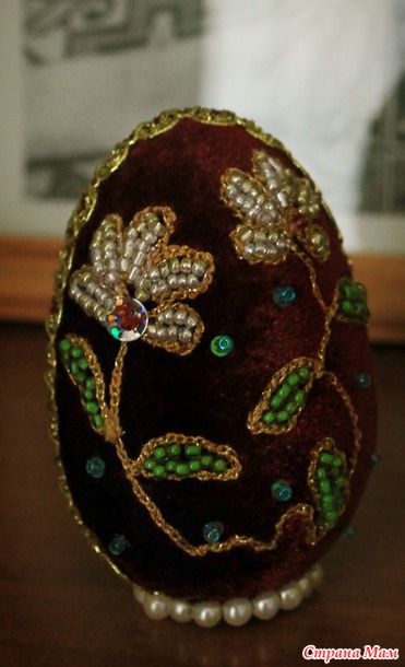 Есть у моего мужа друг, который живет в монастыре послушником. Каждую Пасху он дарит братии пасхальные сувениры - яйца. Такая у него добрая традиция. Правда, любит он заказывать их заранее, великим постом, когда в лавках яиц или мало или нет совсем. И в этот раз мы обегали весь город, не хватило двух. Пришлось мне самой взяться за их создание. Не судите строго: два недостающих яйца в моем исполнении. Первое из бархата с бисером, второе - расписано акриловыми красками. Заготовки использованы деревянные (хорошо, что давно у меня были приобретены на "всякий случай"