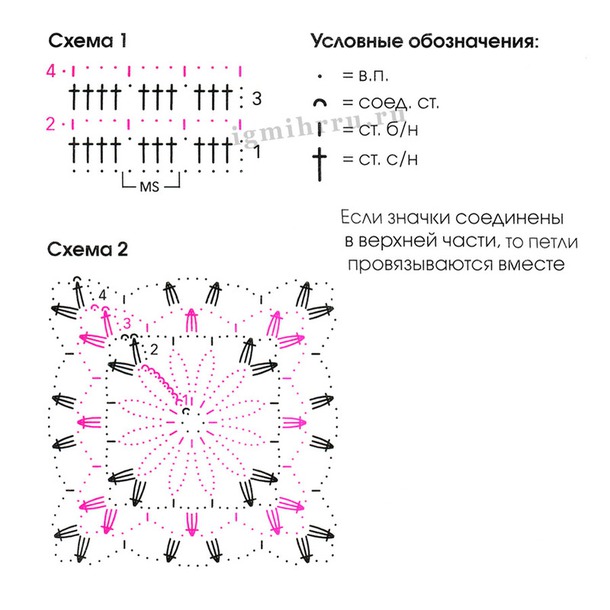 Квадрат: выполнить цепочку из 6 возд. п. и замкнуть ее в кольцо при помощи 1 соед. ст. Вязать по схеме 2 круговыми рядами. Каждый круговой ряд начать с начальных возд. п. по схеме и закончить 1 соед. ст. При необходимости перейти к началу кругового ряда, выполняя соед. ст. Выполнить 1 раз 1-4-й круговые ряды.