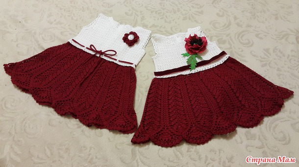 Девочки разные по возрасту и росту, платья примерно на рост около 86 см. Ушло по 1 моточку Сосо на кокетку и по 2 мотка "Лама" на юбку.