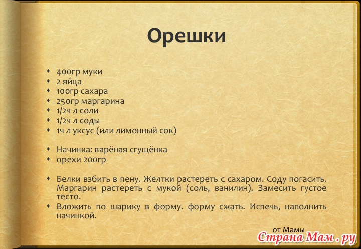 Вот такой рецепт мне дала знакомая, когда форму свою в аренду мне давала. Я по нему делала, очень понравились орешки.
