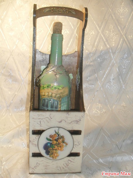 Короб для вина, работа выполнена в подарок. На ней результат моего обучения. Фон полностью нарисован мной, грозди вырезаны из салфетки. Объёмный рисунок через трафарет. Я работой очень довольна.